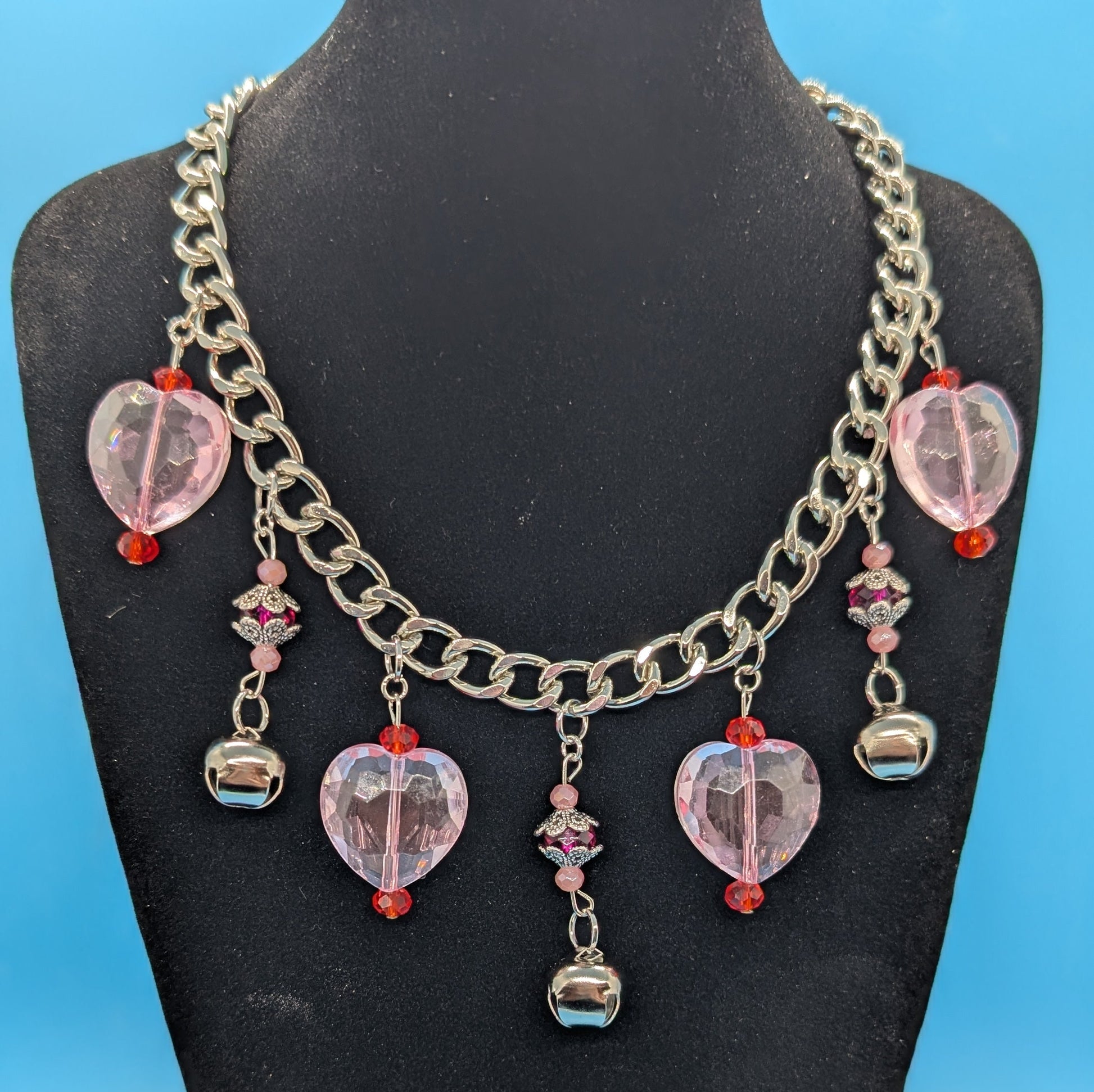 Nickel-free iron chain choker with bells and pink heart charms.