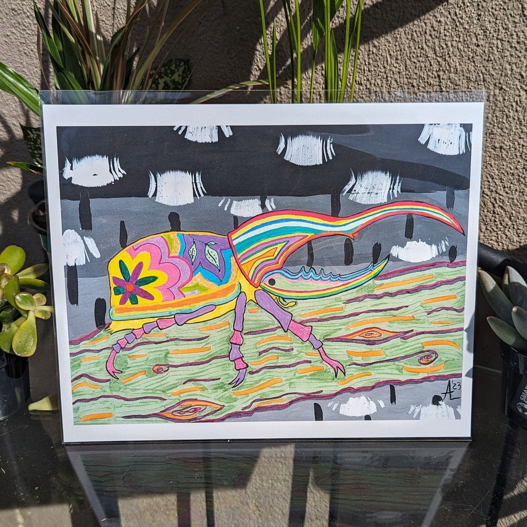 8x10 inch art print in a plastic sleeve. Original piece made with colored pencil, ink, and acrylic paint.